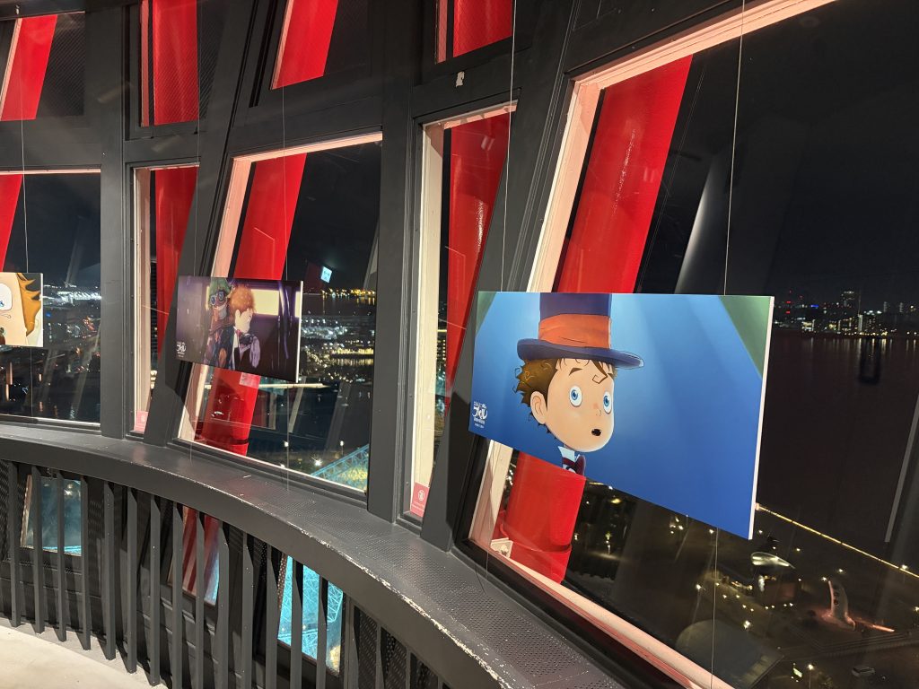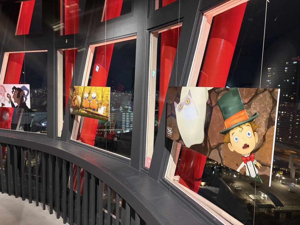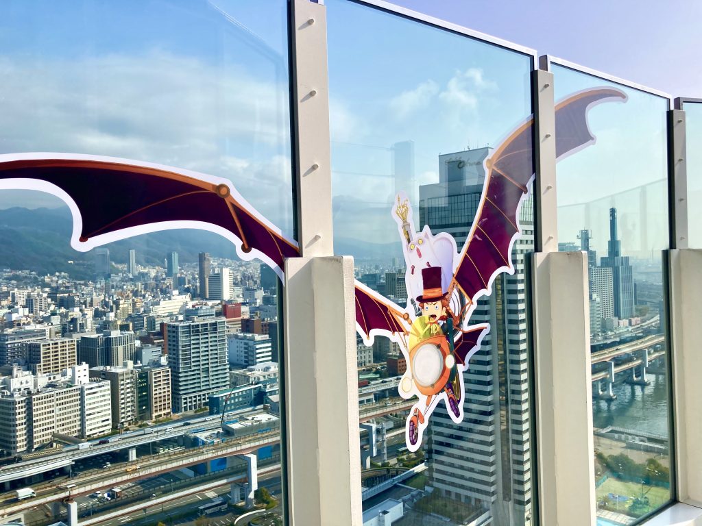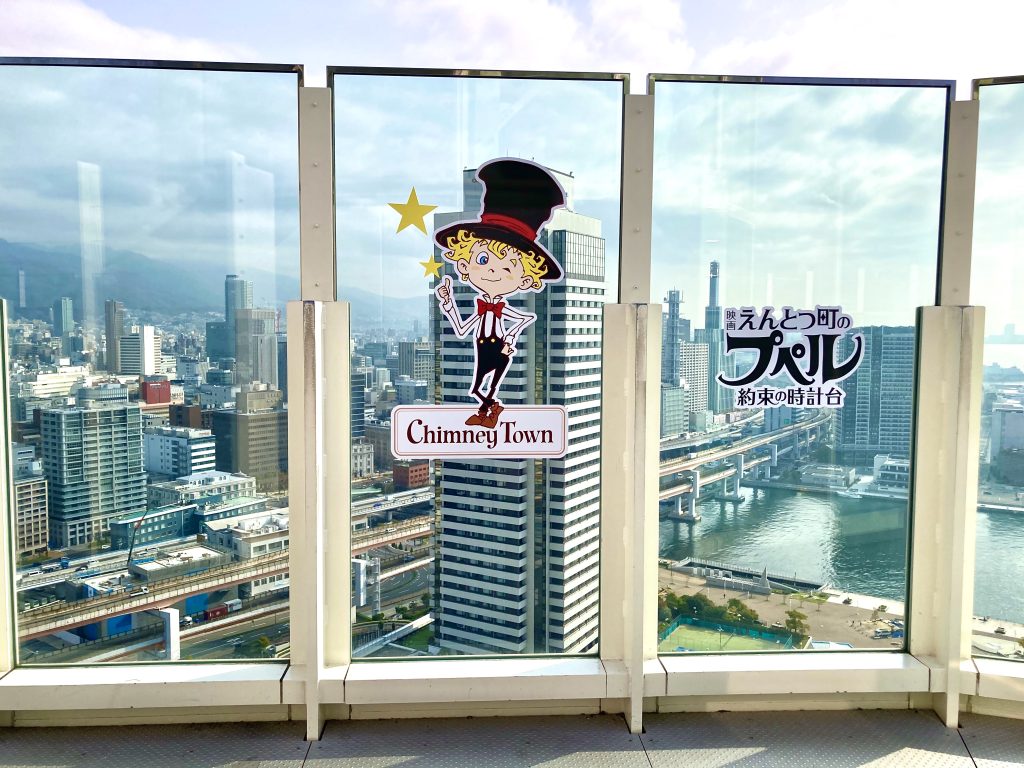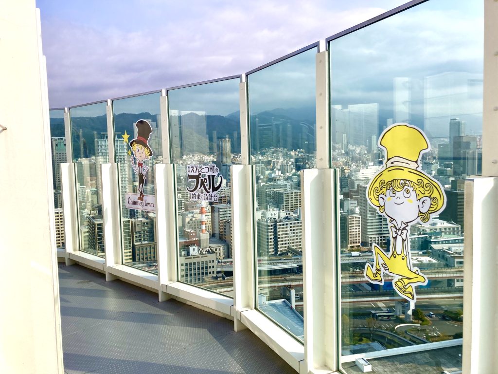 地上約100mの屋上デッキでは、ガラス面にルビッチやプペルたちのキャラクターステッカーを配置しています。夜になると、美しく輝く神戸の夜景を背景にキャラクターたちが浮かび上がり、まるで映画のワンシーンのように空に浮いているかのような幻想的な写真を撮影いただけます。