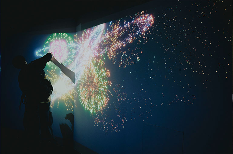 写真映えするLEDネオンのアートのほか、動きに合わせて足元の絵が動く床、触れると花火が上がる壁など、インタラクティブなアートも展示しています。
