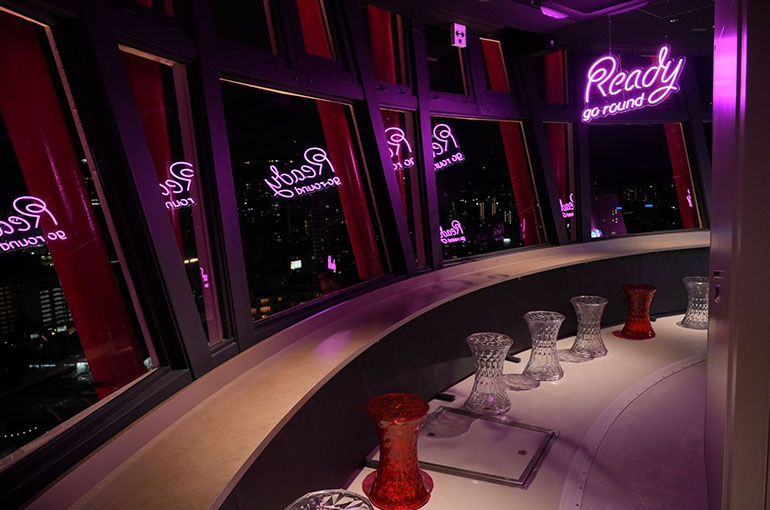 ドーナツ状のフロアが、自動で360度回転する不思議なお店。移り変わる神戸の風景を眺めながら、オリジナルドリンクやスイーツなどの軽食をお楽しみいただけます。